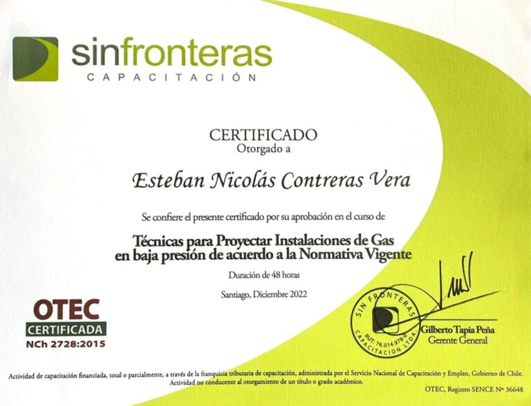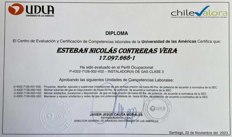 Contamos con respaldo de METROGAS y certificación SEC (Superintendencia de Electricidad y Combustibles). Tenemos un diplomado en la Universidad de las Américas.